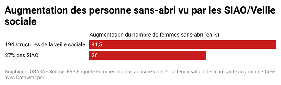 Une augmentation du nombre de femmes sans-abri plus forte que celle constatée par les SIAO (cf. Étude FAS, Volet 1) : 15 points d’écart qui peuvent s’expliquer notamment par la part de non-recours au 115 de certaines femmes, inconnues des bases de données des SIAO.